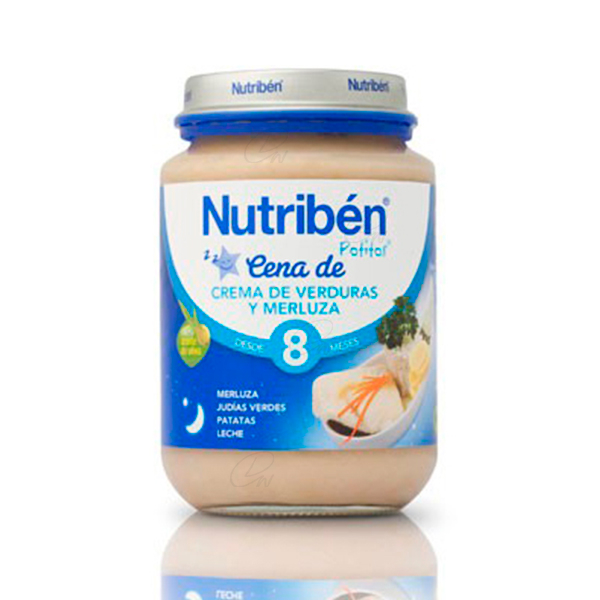 Patatas, leche adaptada 22% (leche desnatada y proteínas de leche), agua de cocción, merluza 10%, judías verdes, arroz, almidón de maíz, cebolla, aceite de oliva 1,5% y sal.